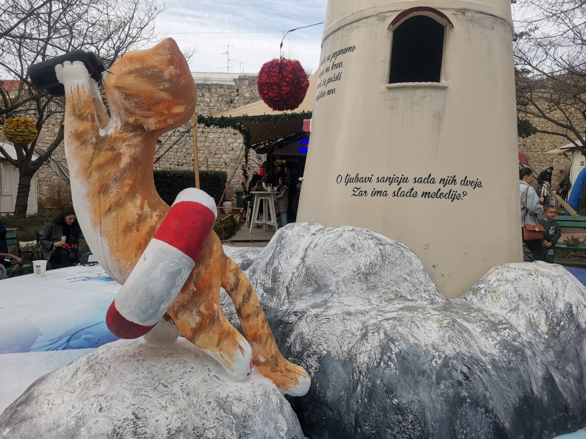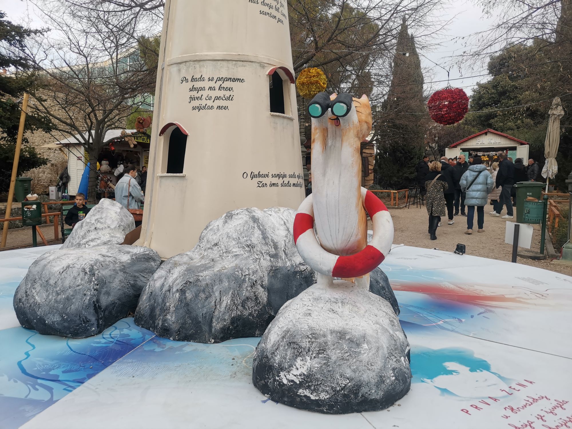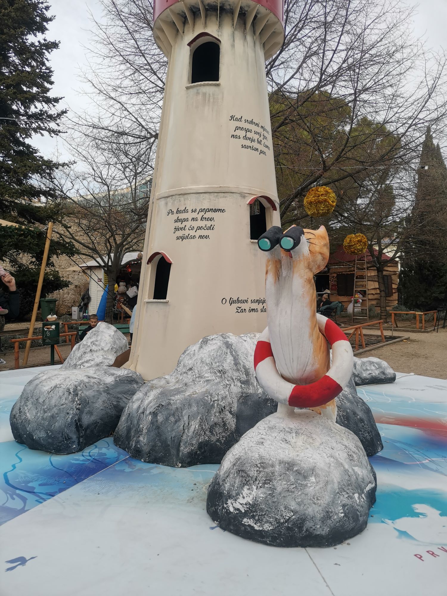 Vesna Parun rođena je na otoku Zlarinu, a dio djetinjstva provela je i u Šibeniku. More i otoci bili su joj inspiracija za brojna djela pa tako i roman u stihovima ‘Mačak Džingiskan i Miki Trasi’ koji inspirira ovu maštovitu skulpturu, posvećenu omiljenim likovima iz školskih lektira.