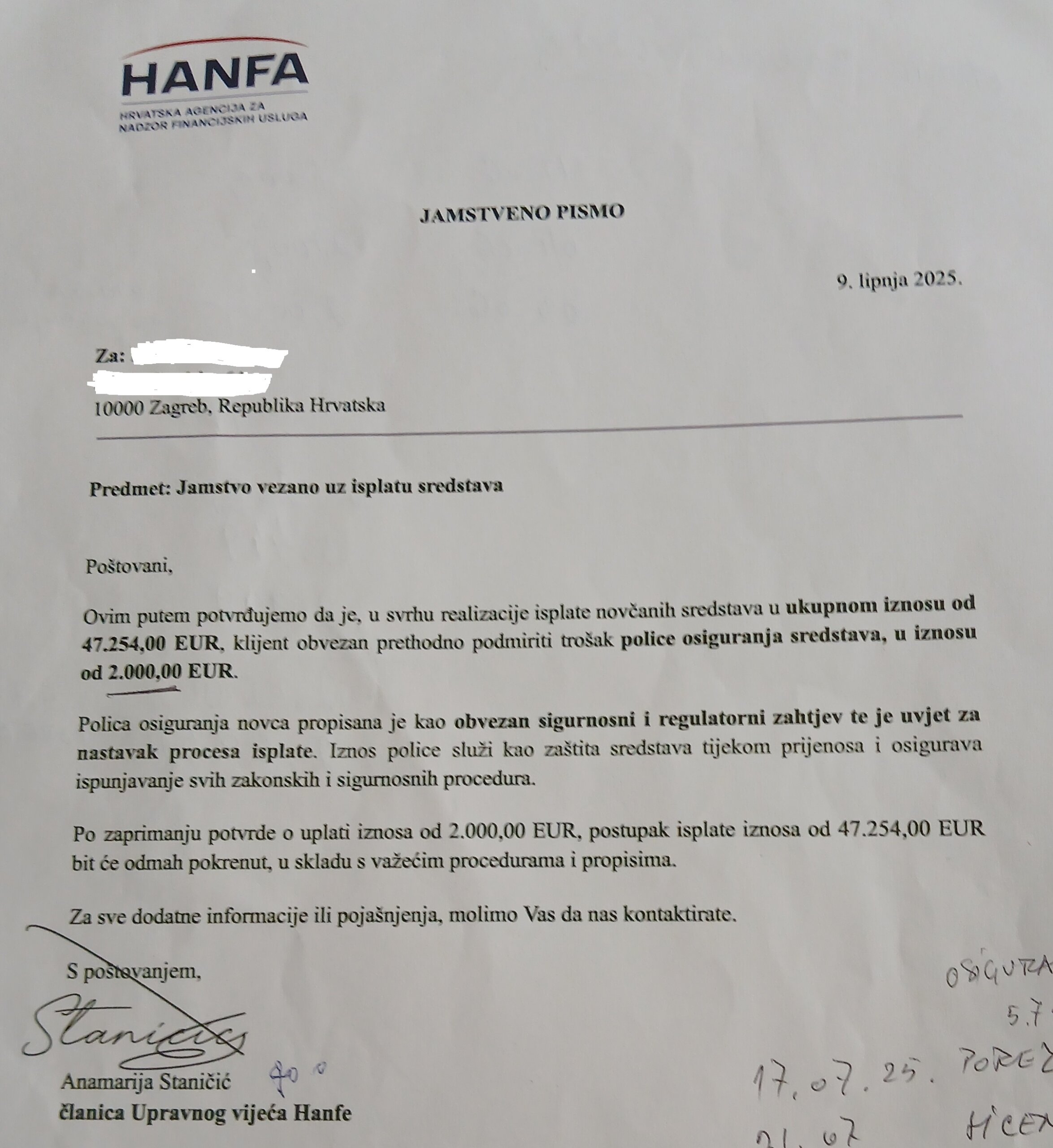 – Još jednom napominjemo da Hanfa nikada ne šalje građanima dopise sa zahtjevom za uplatu radi realizacije bilo kakve investicije, porezne obaveze ili obaveze osiguranja plaćanja. Uvijek JE riječ o nastavku već ranije započete prijevare na koju su građani nepažnjom nasjeli. Pozivamo građane da svoj novac ne povjeravaju neprovjerenim ‘financijskim savjetnicima’ jer je najčešće riječ o prevarantima, upozorili su.