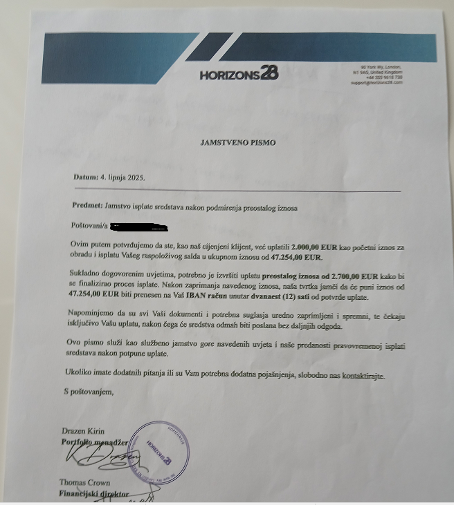 Prevaranti su sve vičniji tome kako doći do novca građana. Pojavilo se korištenje lažnih dopisa Hanfe, Europske središnje banke i FINA-e u investicijskim prijevarama, kako su upozorili iz Hanfe. U posljednje vrijeme takav je slučaj zabilježen na internetskoj platformi Horizons 28, a sami dopisi mogu vizualno djelovati uvjerljivo, kako su objasnili. Upozorili su da Hanfa nikada ne šalje dopise sa zahtjevom za uplatu radi realizacije bilo kakve investicije.