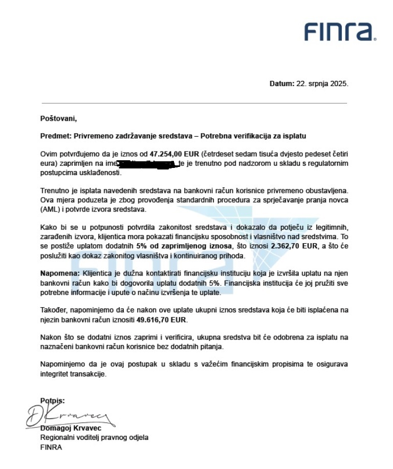 – Dodatna uplata traži se pod izgovorom plaćanja poreza, naknade ili sklapanja police osiguranja sredstava kao uvjeta za nastavak procesa isplate novca, koji je ‘na čekanju’. Zahtjevi za uplate uglavnom su ‘hitni’. Odnosno uplatu je potrebno izvršiti u vrlo kratkom roku. U nekim dopisima se navodi i točan IBAN broj računa građanina, koji je on sam učinio dostupnim prevarantima. Sami dopisi mogu vizualno djelovati uvjerljivo. No na njima se ne navode nikakvi kontakti ni telefonski brojevi na koje bi se institucija mogla kontaktirati, naveli su.