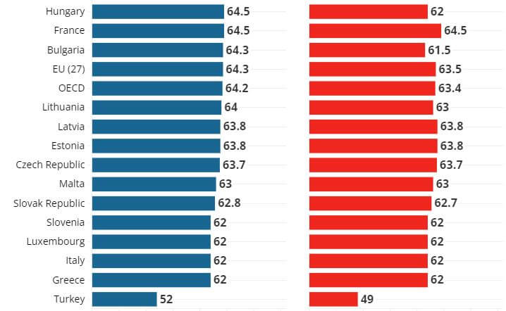 Dob za odlazak u mirovinu nije isti u svim zemljama, a najniža dob za umirovljenje je ona od 49 godina za žene, odnosno 52 godine za muškarce i to u Turskoj, dok je najviša dob za umirovljenje u Norveškoj, a ona iznosi 67 godina za žene i muškarce. Ovi podaci su dio statistike iz 2020. godine o dobi odlasku u mirovinu zemalja članica Organizacije za ekonomsku suradnju i razvoj (OECD). Donosimo vam tablične prikaze kod kojih se od ovih zemalja najranije, a u kojima najkasnije odlazi u prijevremenu i starosnu mirovinu, ali i kako izgledaju predviđanja za 2060. godinu.