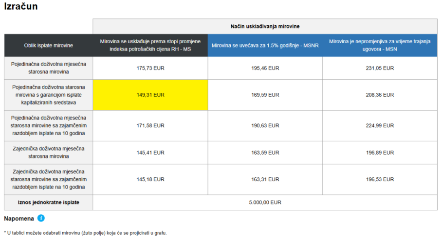 Tablica izračuna RMOD-a prikazuje i koliko bi mirovina iznosila za svaki pojedinačni oblik isplate u slučaju drugačijeg načina usklađivanja. Tri su opcije usklađivanja: prema stopi promjene indeksa potrošačkih cijena, s uvećanjem od 1,5 posto godišnje te bez promjena. Zahvaljujući tablici, jasno je da su iznosi nepromjenjivih mirovina veći. Također, vidljivo je da su pojedinačne mirovine više od zajedničkih, ali i kako se umanjuju jednokratnom isplatom ili zajamčenim razdobljem isplate.