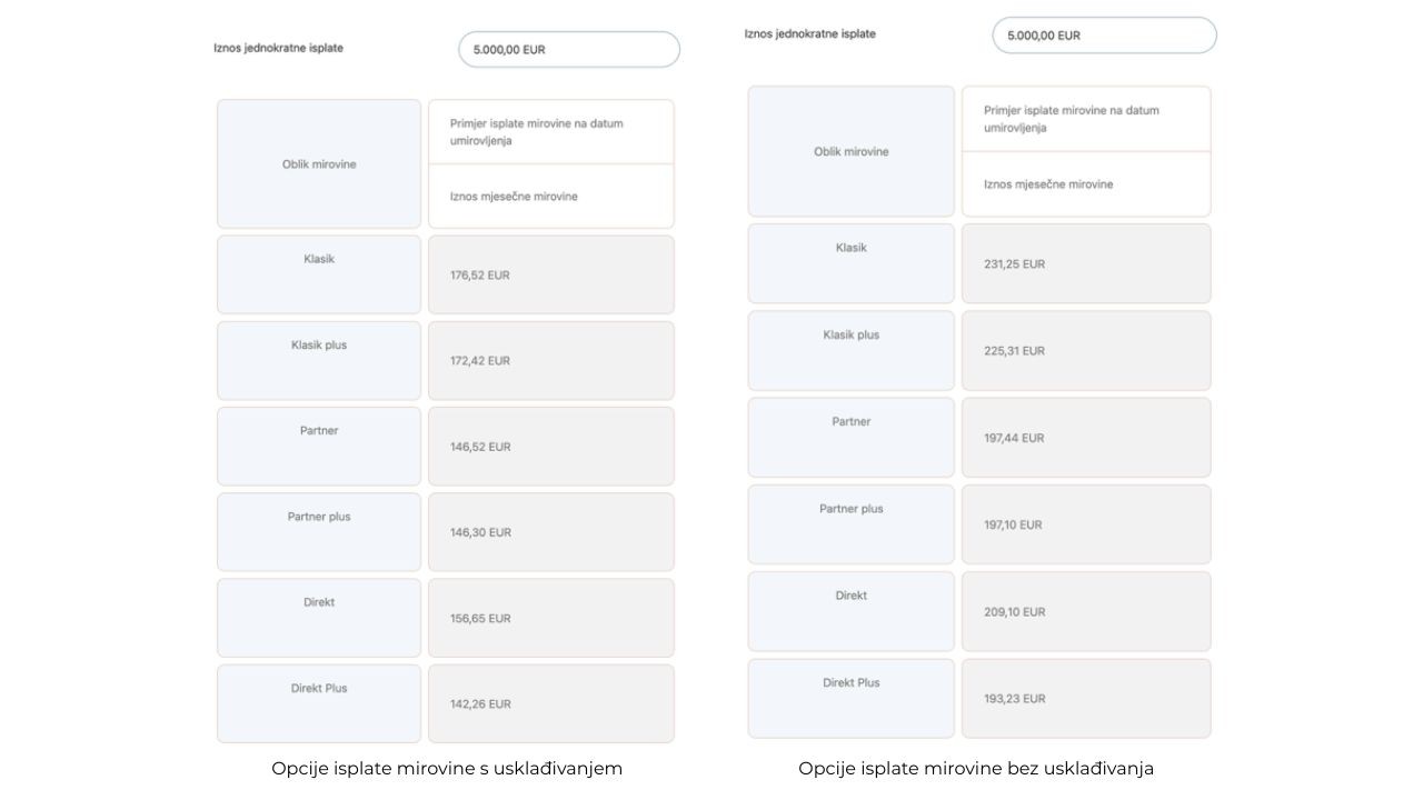 U tom pogledu, kalkulator HRMOD-a ima manu zato što pri izračunu izlista sve oblike mirovine koje je moguće ugovoriti s njima, kao što su Klasik, Klasik plus, Partner, Partner Plus i slično, uz iznos, ali bez objašnjenja o čemu se radi. Iz njega je vidljivo da je s usklađivanjem opcija Klasik najisplativija s 176,52 eura dok je opcija Direkt Plus najniža sa 142,26 eura. Ipak, korisnik mora na stranici pronaći zasebnu tablicu uz koje je vidljivo da se Klasik odnosi na isplatu pojedinačne starosne mirovine bez zajamčenog razdoblja dok se Direkt Plus odnosi na isplatu zajedničke starosne mirovine uz jednokratni povrat.