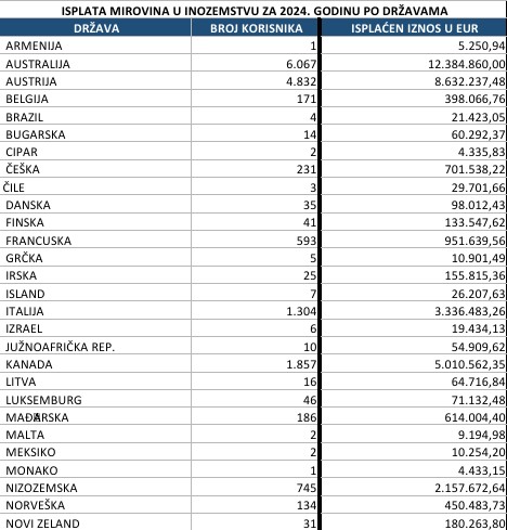 Njemačka se nalazi na trećem mjestu prema brojnosti, a tamo je lani isplaćeno ukupno 14.743 inozemnih mirovina vrijednih više od 20 milijuna eura. Nakon ove tri zemlje, inozemnih mirovina u Sloveniji bilo je 9.272, prema podacima HZMO-a za 2024. godinu. Zatim, inozemnih mirovina isplaćenih u Australiju bilo je 6.067, vrijednih više od 12 milijuna eura.
