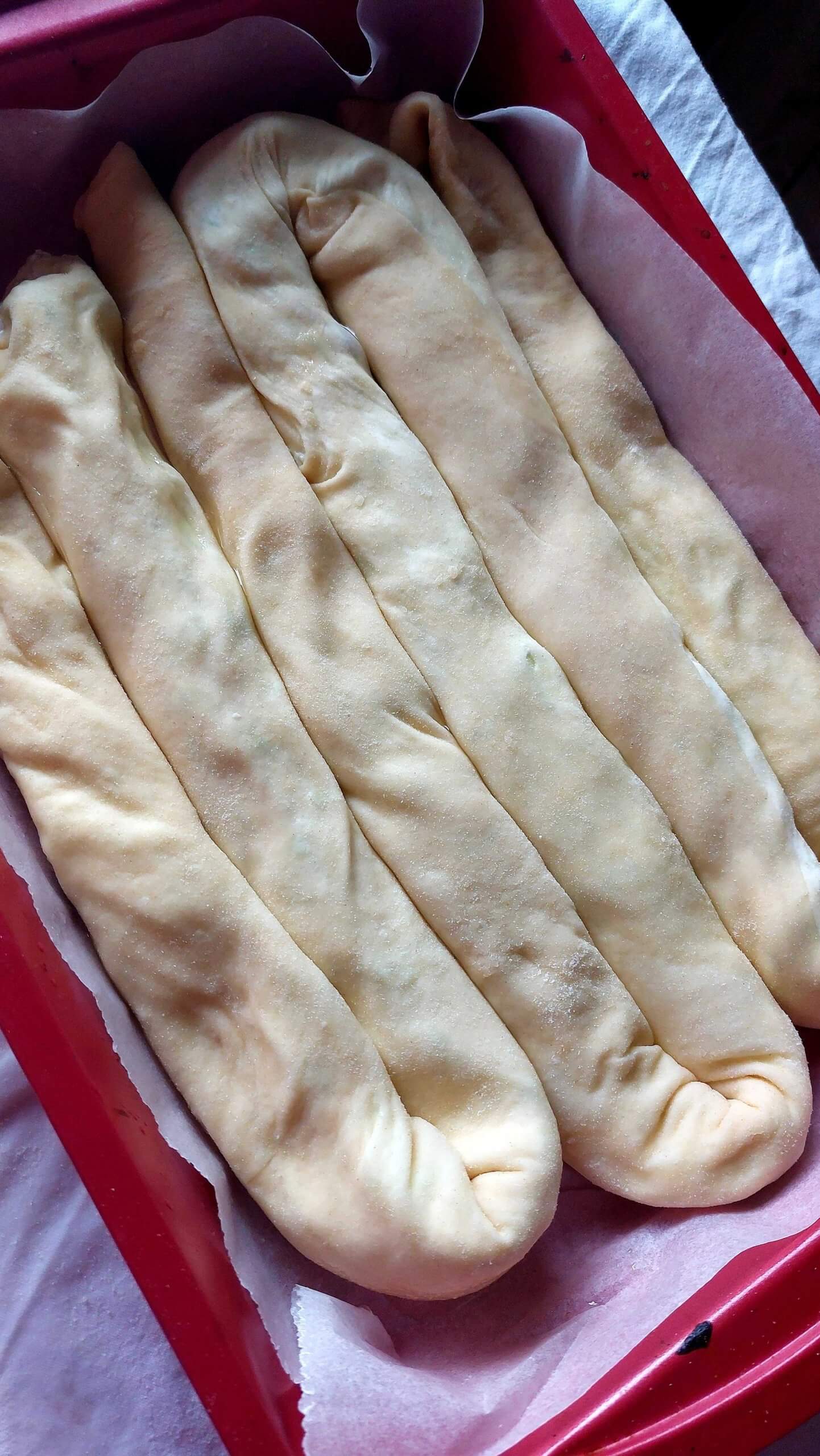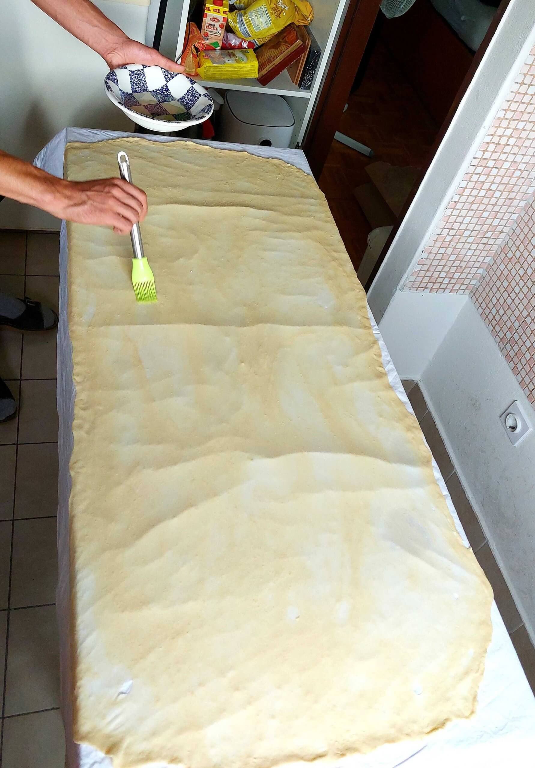 Ulje u kojemu je bilo tijesto ne bacamo nego njime ‘poškropimo’ ili lagano premažemo ulje po razvučenom tijestu. Na rubove tijesta stavite nadjev i sa svake strane uz pomoć plahte zarolajte tijesto da dobijete dvije rolade.