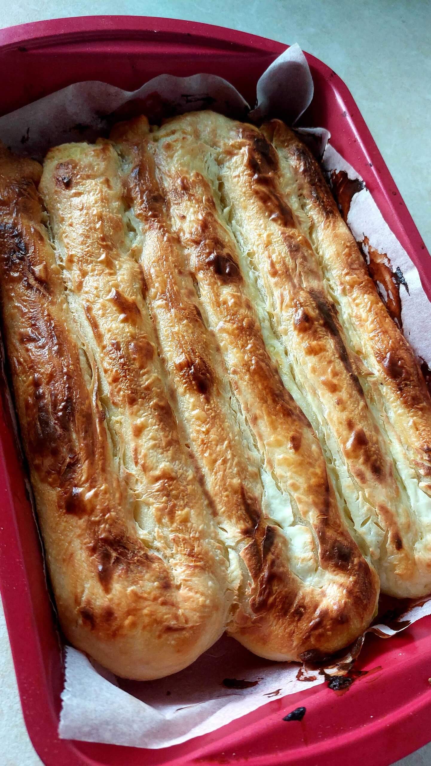 Prerezati nožem tijesto u sredini između tih ‘roladica’ i svaku posebno još zarolati da se pokupi taj višak odrezanog tijesta. Nauljiti protvan i posložiti tijesto kao na fotografiji. Premazati vrhnjem i peći u zagrijanoj pećnici na 180 stupnjeva dok ne dobije zlatno-smeđu boju, kao na slici.