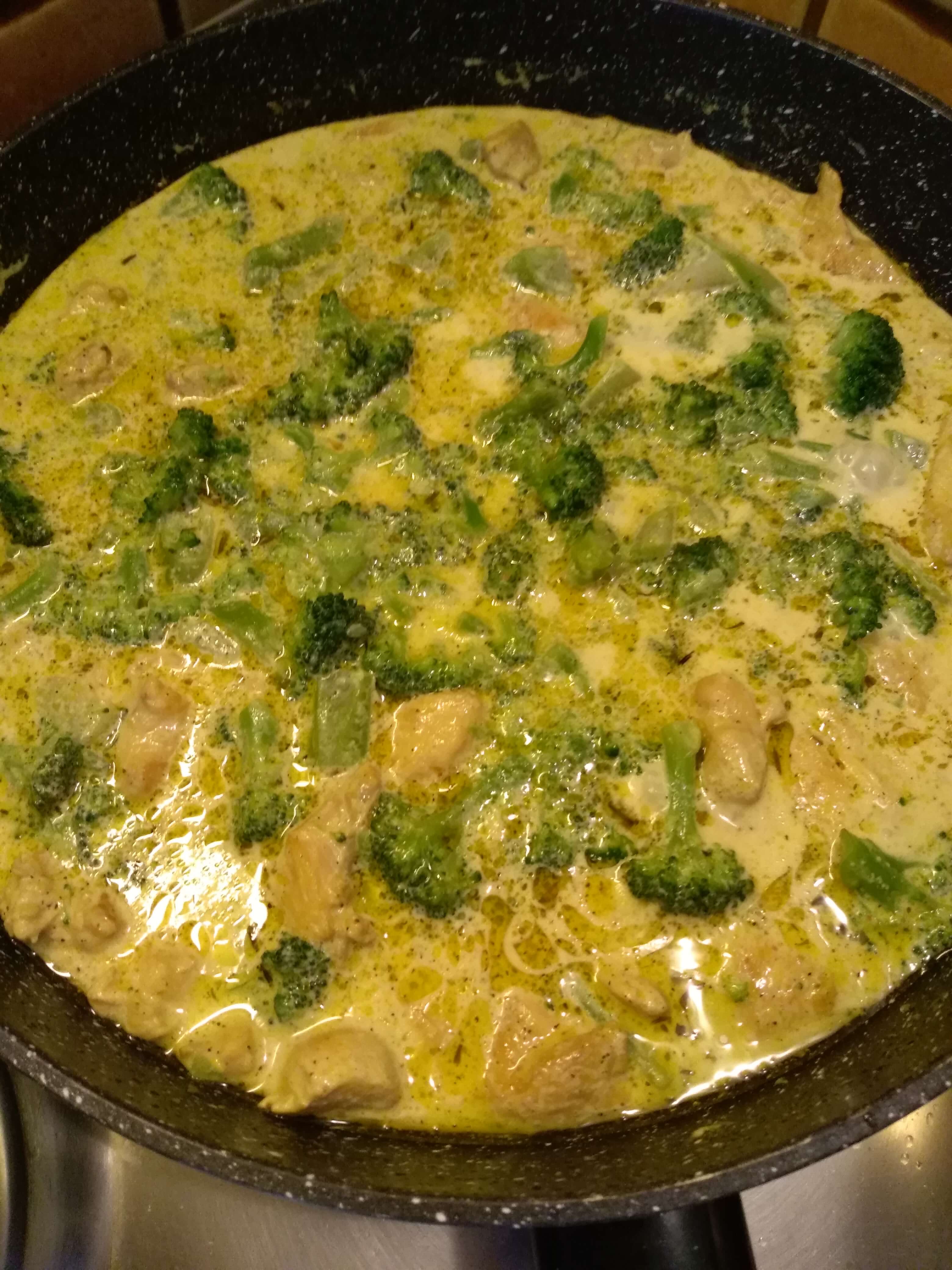 - Dok se kuha brokula, pileća prsa očistite od hrskavice (ako već nije odvojeno) i narežite na manje kockice te pecite u dubljoj tavi na malo maslinova ulja dok meso ne porumeni s obje strane. Pred kraj pečenja posolite i popaprite te po želji dodajte malo žutog ‘kari’ praha. Kada je meso ispečeno, podlijte ga vodom u kojoj se kuhala brokula.