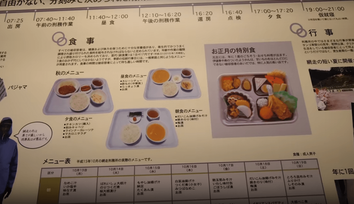 Zatvori u Japanu su namjenjeni za resocijalizaciju, reformiranje i rehabilitaciju prijestupnika. Iako su financijski moćni, zatvori im nisu toliko luksuzni. No, jedna od najvećih pogodnosti jest zatvorska hrana, koja slovi među najzdravijom zatvorskom hranom u svijetu. Ni besplatna medicinska skrb im neće odmoći.