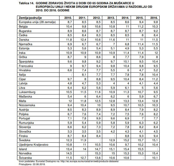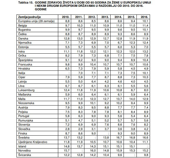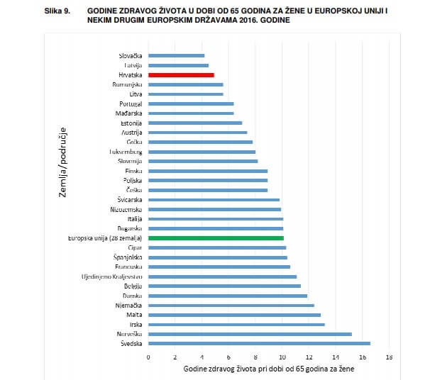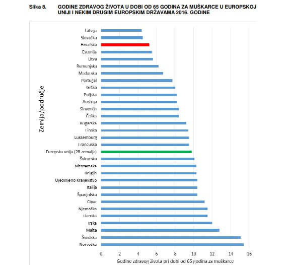 “Muškarci u EU-28 u dobi od 65 godina mogu očekivati još 9,8 zdravih godina života, a žene 10,1 godinu. Najveći očekivani broj godina zdravog života nakon 65-e godine imaju muškarci u Švedskoj (15,1), Malti (12,8) i Irskoj (12), kao i žene (Švedska – 16,6, Irska – 13,2 i Malta – 12,9). Najmanji očekivani broj zdravih godina života kod muškaraca nakon 65-e godine imaju Latvija (4,4), Slovačka (4,5) i Hrvatska (5,2), isto kao i kod žena: Slovačka (4,2), Latvija (4,5) i Hrvatska (4,9) – piše u Izvješću HZJZ-a temeljenom na podacima Eurostata.