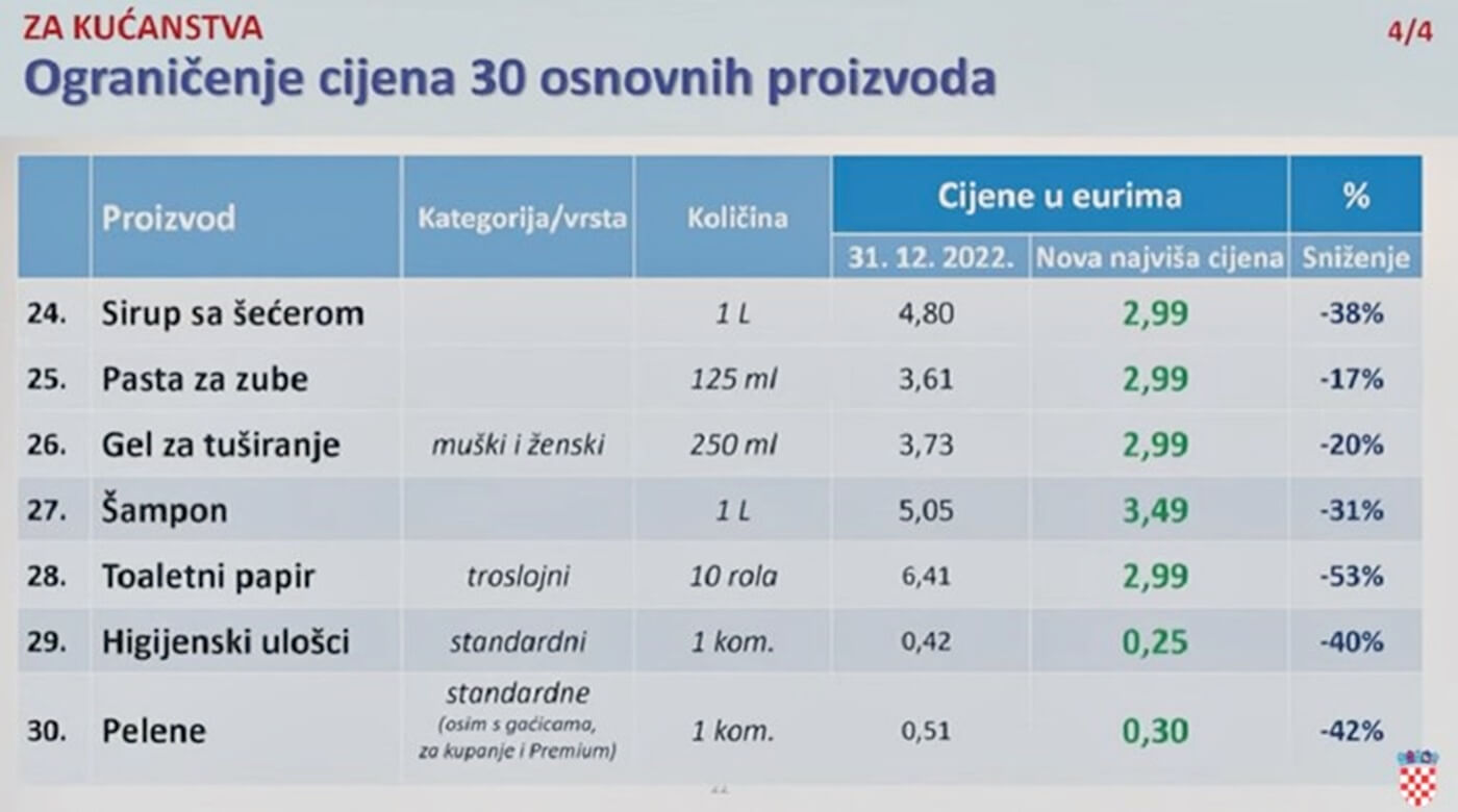 Čak 20 trgovaca nije se pridržavalo zaštićene cijene obične mliječne čokolade od 1,29 eura za 80 ili 100 grama ovog proizvoda. Tu su i prekršene cijene sirupa sa šećerom od 2,99 eura po litri, paste za zube od 125 mililitara od najviše 2,99 eura, gela za tuširanje od 250 mililitara za također 2,99 eura, a dobar dio povreda odnosi se i na toaletni papir. Naime, nijedno pakiranje koje sadrži deset rola troslojnog papira, bez obzira na marku, ne smije biti skuplje od 2,99 eura. Povrijeđene su i ograničene cijene higijenskih uložaka, pelena te junećeg vrata s kostima koji ne smije koštati više od 6,99 eura.
