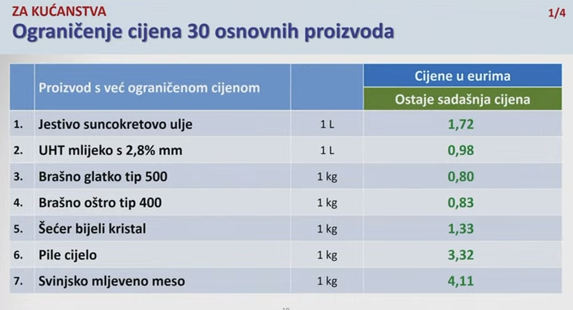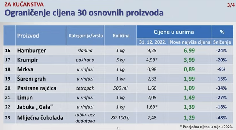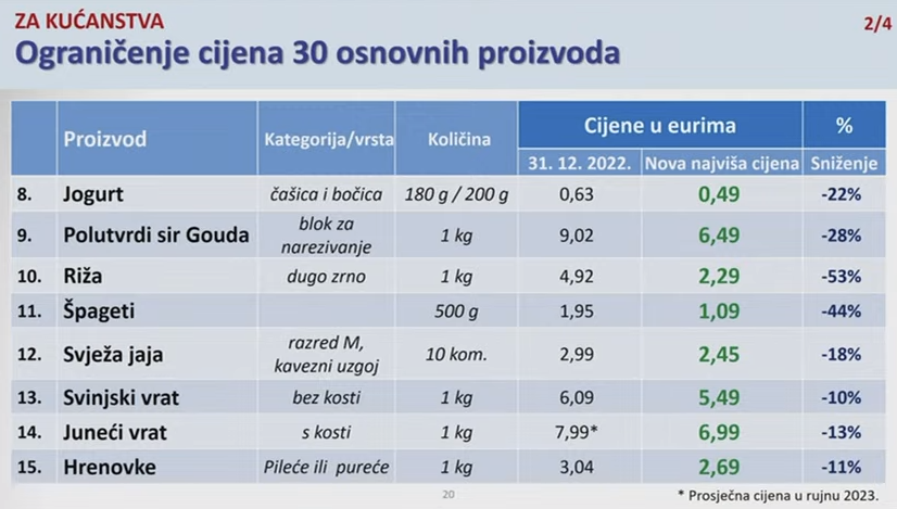 Trgovci su najviše kršili ograničenu cijenu litre trajnog mlijeka s 2,8 posto mliječne masti, pri čemu je inspekcija pronašla čak 21 povredu. Ovo mlijeko ne smije se prodavati po cijeni većoj od 0,98 eura. Trgovci nisu poštivali ni ograničenu cijenu suncokretova ulja od 1,72 eura, šećera od 1,33 eura te brašna pri čemu glatko košta 0,80, a oštro najviše 0,83 eura. Prekršena je i cijena jogurta u čašici ili bočici od 180 ili 200 grama koja ne smije prelaziti 0,49 eura te sira Gauda za rezanje s ograničenom cijenom od 6,49 eura. Prekršitelji se nisu pridržavali ni cijene špageta od 500 grama od 1,09 eura, kao ni deset svježih jaja M veličine od 2,45 eura.