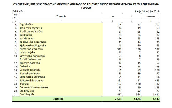 Kada brojčano stanje radno aktivnih umirovljenika promotrimo po županijama, vidimo da ih je logično najviše na području Zagreba, oko 1.400, a među županijama najviše rade u Primorsko-goranskoj županiji (532), zatim Splitsko-dalmatinskoj (433), Istarskoj (312 ) i Zagrebačkoj županiji (312).