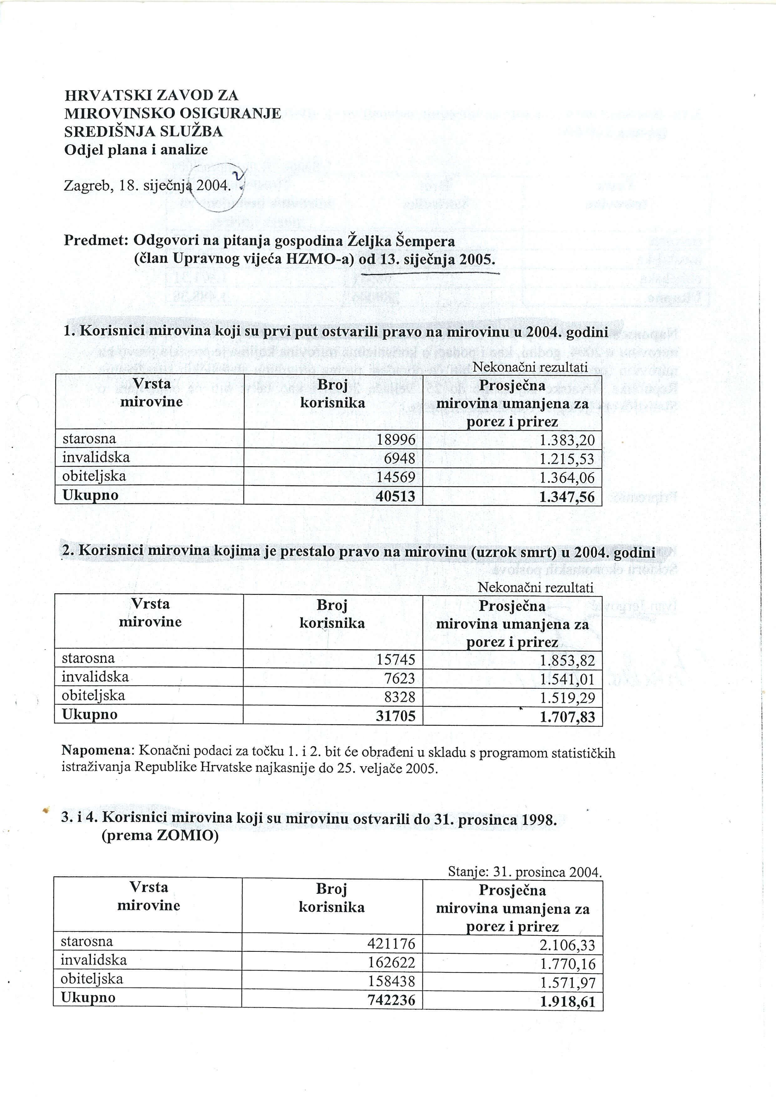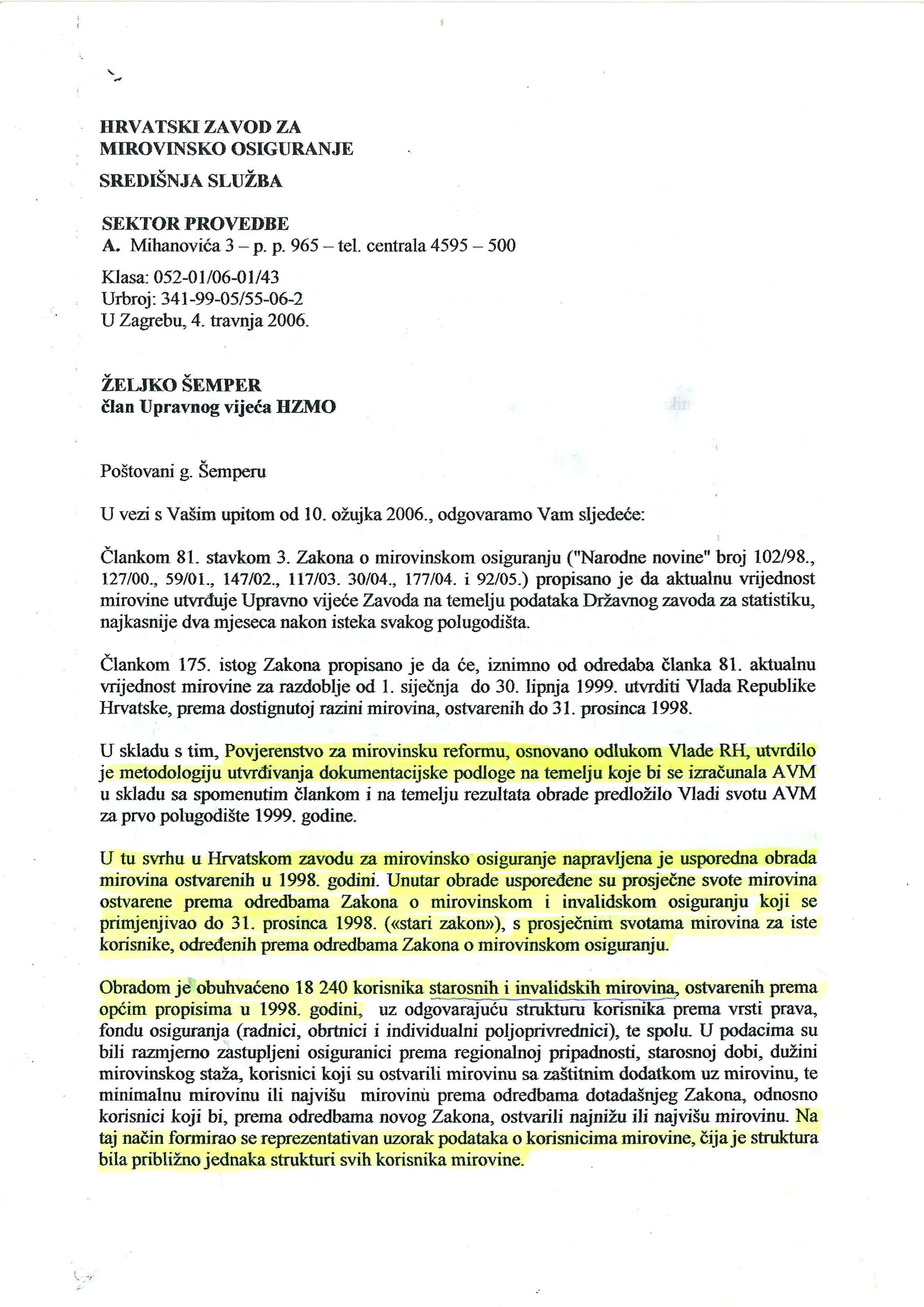 Šemper je pisao tadašnjem ravnatelju HZMO-a, a odgovor i obrazloženje dobio je 2006. godine upravo od pomoćnika ravnatelja i predsjednika Povjerenstva za mirovinsku reformu.