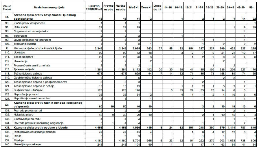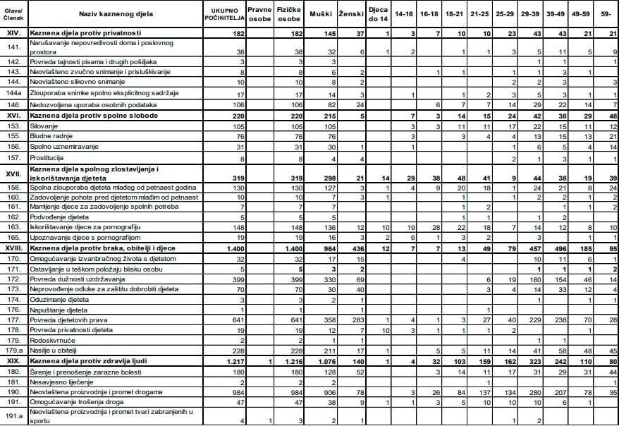 Prema statističkim podacima, najviše su kaznenih djela u 2022. godini osobe starije od 59 godina napravile u prometu. Prema zakonskoj klasifikaciji su osobe starije od 59 godina najviše počinile razna kaznena djela. Tako je na primjer, njih 845 počinilo kazneno djelo protiv osobne slobode, njih 81 je počinilo kazneno djelo protiv zdravlja ljudi.