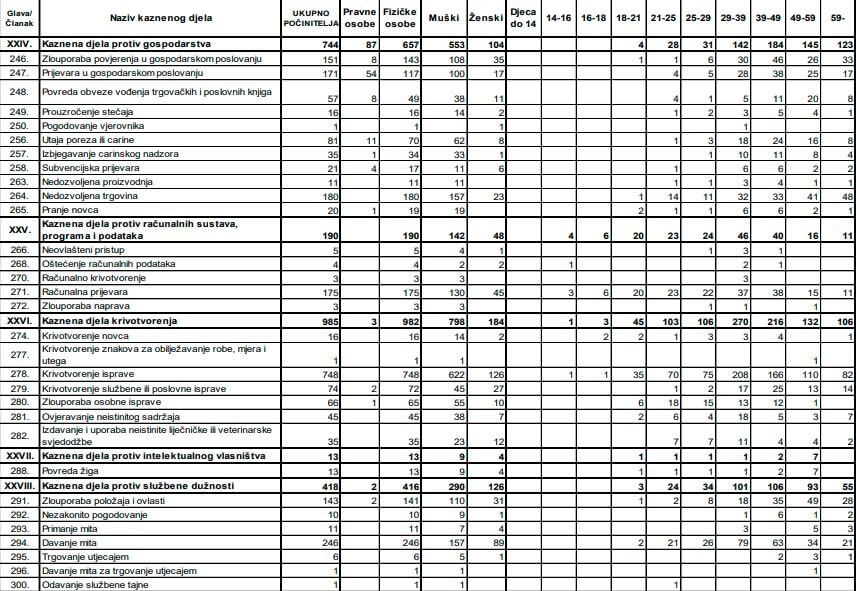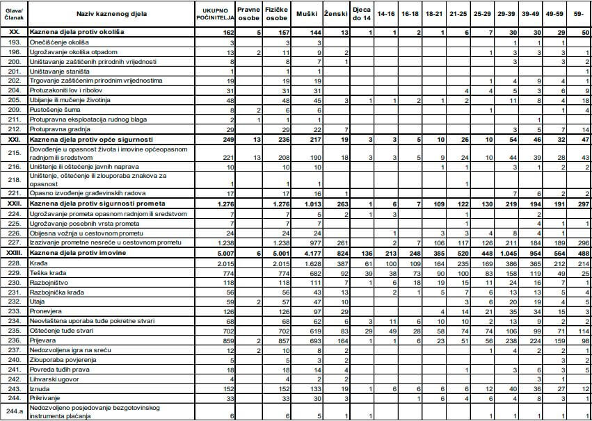 Zanimljivo je kako je od svih dobnih skupina, upravo skupina osoba s 59 i više godina u 2022. godini počinila najveći broj kaznenih djela u prometu, točnije 297 osoba je skrivilo neko kazneno djelo u prometu. Veliki broj njih, 488 je počinilo i kaznena djela protiv imovine. Njih 106 je počinilo kazneno djelo krivotvorenja.
