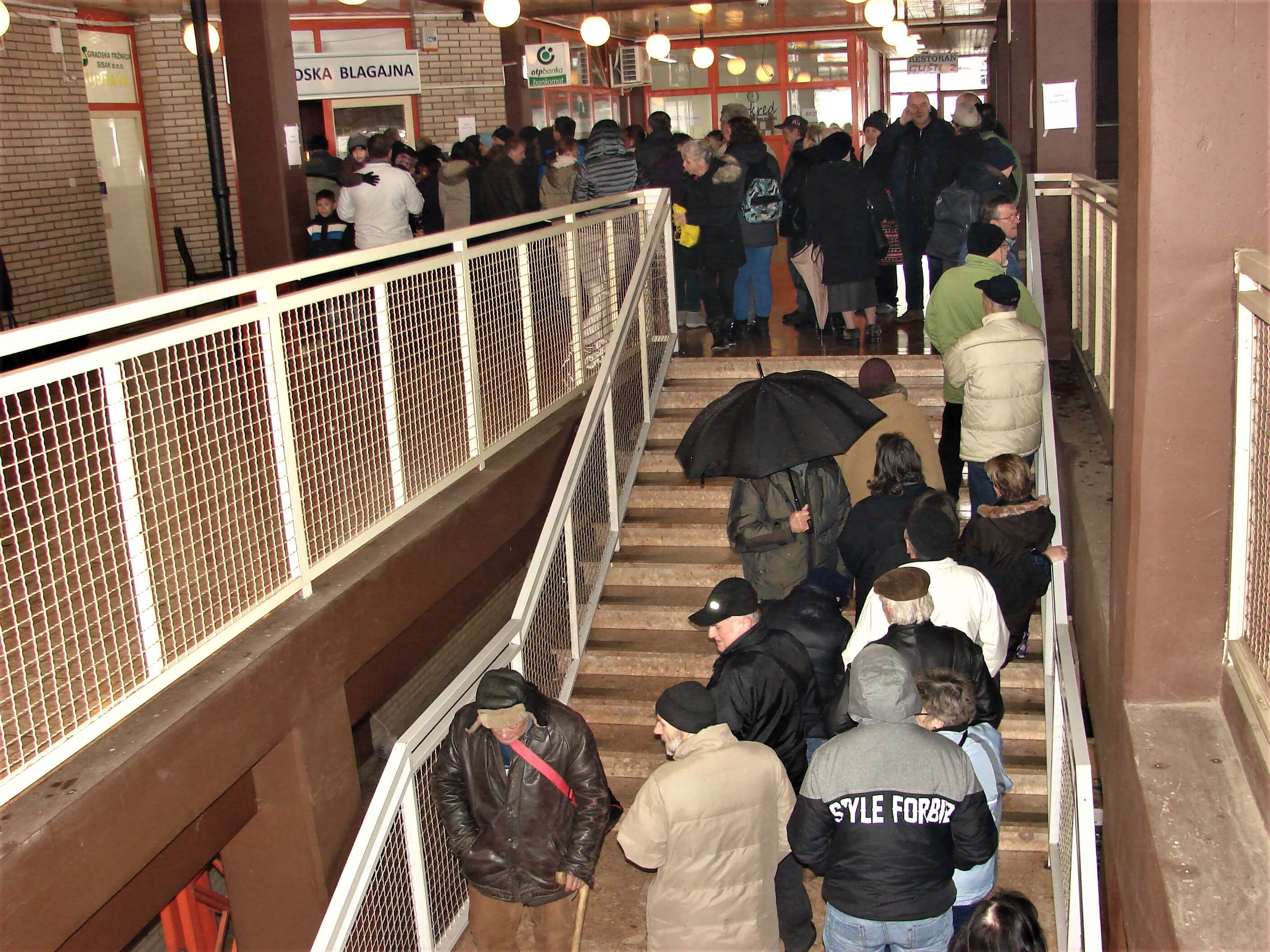 Gužva na sisačkoj tržnici od ranog jutra, ali ne zbog voća i povrća, nego uskrsnica. Stotine umirovljenika i nezaposlenih formirale su red već od 7 sati, iako je podjela prvog dana isplate zakazana tek od devet. Kolona se protezala od vanjskog ulaza na tržnicu sve do kata na kojem je smještena gradska blagajna. Satima su stajali na hladnoći, a djelomice i na kiši za iznose od sto do 300 kuna, koliko je kome već, ovisno o cenzusu, osigurao Grad Sisak.