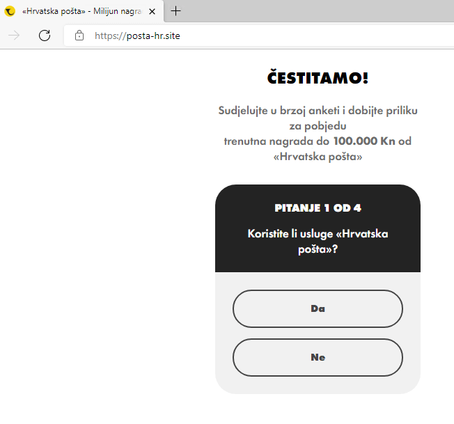 Jedan takav link s lažnom domenom Hrvatske pošte vodi na lažnu Konzumovu anketu i nagradnu igru gdje se korisniku obećaje 50.000 kuna. Ne otvarajte i ne rješavajte, jer bi se prevaranti tako mogli domoći vaših osobnih podataka.