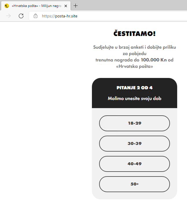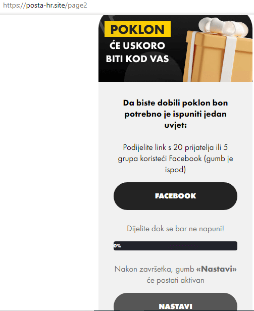 Ako na bilo koju aplikaciju za komunikaciju dobijete poveznicu (link) sumnjivog izgleda koji vodi na zapravo nepostojeću stranicu Hrvatske pošte, ne otvarajte ga. Riječ je, naime, o lažnoj nagradnoj igri u kojoj se nudi novčana nagrada kroz nekoliko jednostavnih koraka, od kojih je jedan i da link podijelite s prijateljima. Svrha prevaranata je domoći se vaših osobnih podataka.