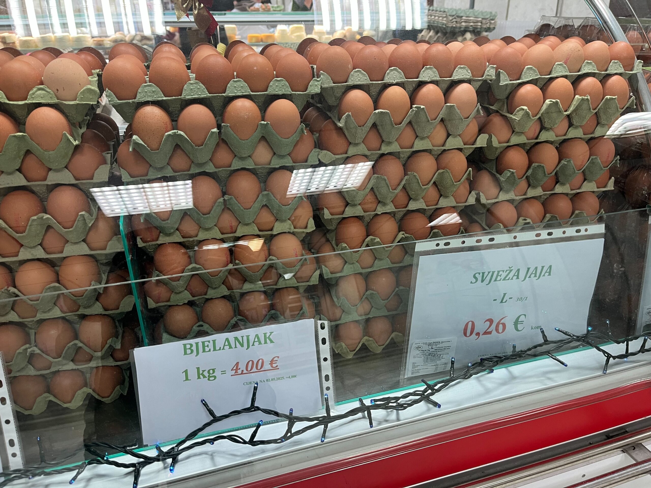 Mnogi će idućih dana trebati jaja, posebno za kolače. Svježa jaja M veličine prodaju se na zagrebačkoj tržnici po komadu za 0,26 eura, dok ona L veličine stoje 0,26 eura. Jaja veličine XL su 0,30 eura po komadu, kako nam je rekla gospođa koja ih prodaje te dodala da još nisu dizali cijene otkako je uveden euro.