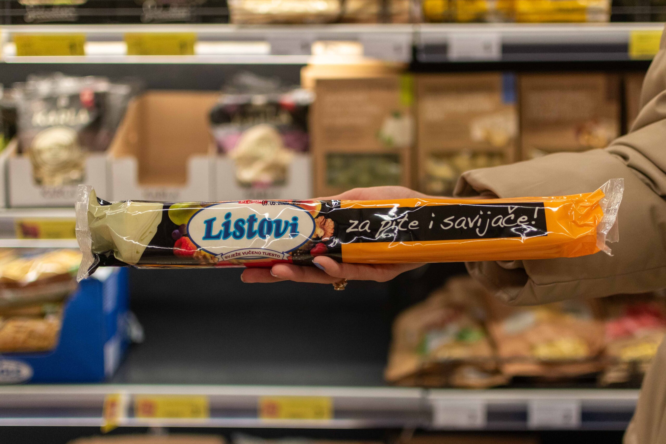 Potom smo se zaputili na odjel mliječnih proizvoda gdje smo pronašli Doline svježi posni sir od kilograma za 3,13 € i Doline jogurt od litre za 1,65 €. Aktivirali smo i kupon za listove za pite i savijače, pa smo ih tako platili 1,18 €, a od ovih sastojaka planirali smo napraviti domaću pitu sa sirom. U košaricu smo dodali i Selection livanjski sir, naprosto mu nismo mogli odoljeti, a platili smo ga 4,31 € za 300 grama.