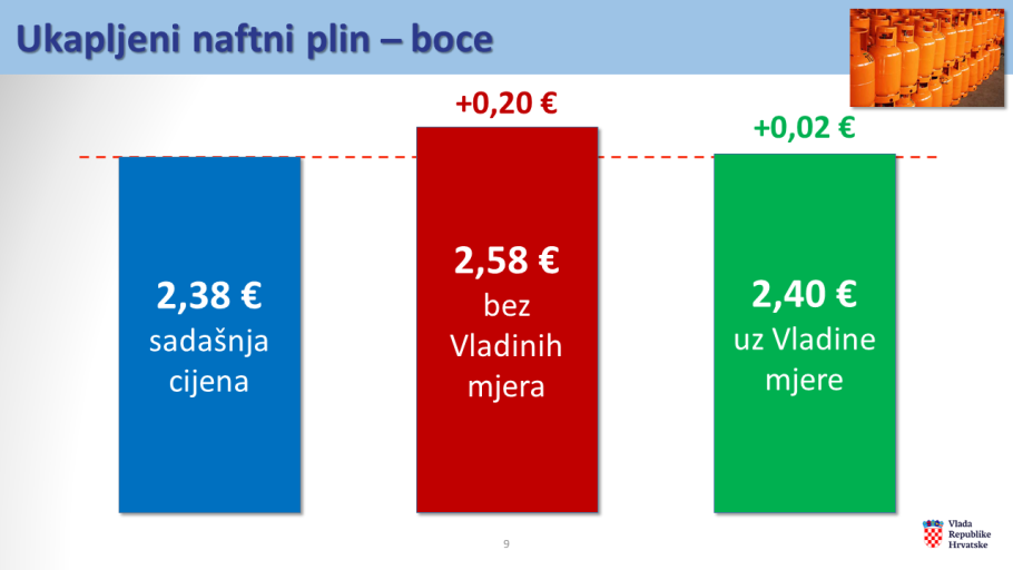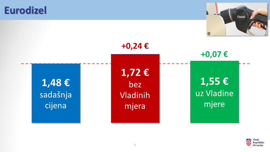 Trenutačna prosječna cijena eurodizela bez aditiva iznosi 1,48 eura po litri, dok bi bez Vladinih mjera cijena porasla na 1,72 eura, odnosno za 24 eurocenta po litri. Svojim mjerama Vlada će limitirati taj rast za samo sedam eurocenti po litri, odnosno cijena bi trebala biti 1,55 eura, kako stoji na stranici Vlade.