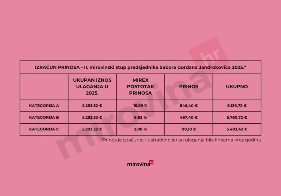 Iako na raspolaganju nemamo informacije o Jandrokovićevom mirovinskom fondu i društvu izbora, poigrali smo se podacima Udruge društava za upravljanje mirovinskim fondovima i mirovinskih osiguravajućih društava (UMFO) o prinosima fondova u 2025. godini, o čemu smo pisali ovdje, i primijenili ih na njegovom primjeru. Za potrebe ilustrativnog izračuna, obradit ćemo podatke s idejom da Jandroković cijelu godinu nije mijenjao kategoriju fonda. Napominjemo da je ovaj podatak posve ilustrativan, jer je predsjednik Sabora novce uplaćivao linearno tijekom godine, a ne odjednom na početku godine.