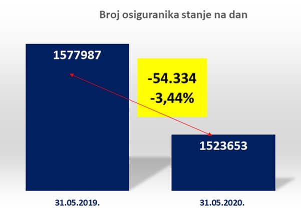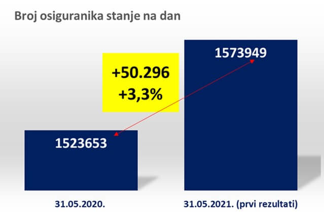 Već četvrti mjesec zaredom Hrvatski zavod za mirovinsko osiguranje bilježi kontinuirani porast broja osiguranika, kojih je prema prvim podatcima na dan 31. svibnja 2021. bilo 1.573,949.
