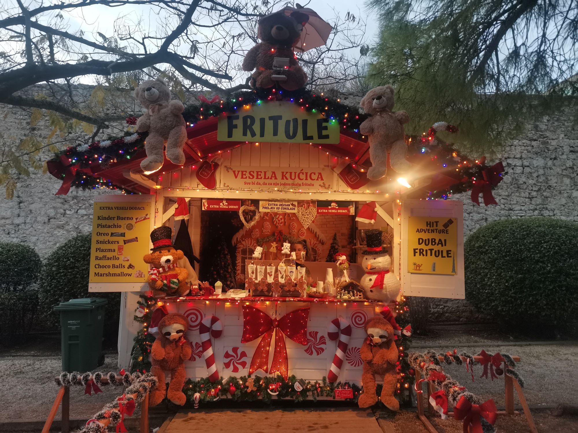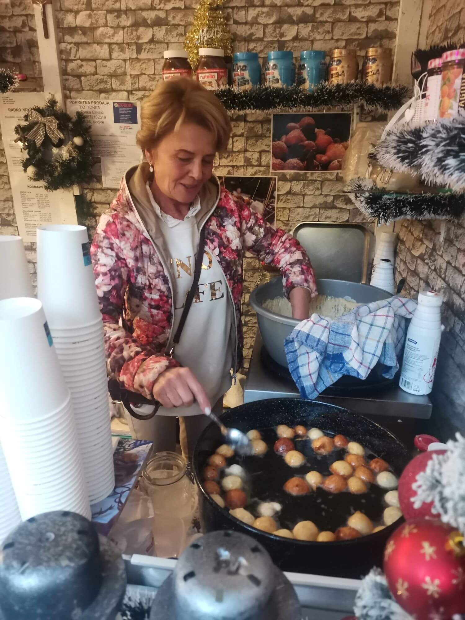 – Umirovljenici najčešće uzimaju velike fritule za pet eura, samo sa šećerom. To bude krcato, a mi uvijek dodamo još koju ekstra. Bake nam kažu da nema šanse da ih peku, jer ih se stvarno puno dobije. Sada su počeli dolaziti po Dubai, jer žele probati. Jedan stariji par nam je rekao da radije dođu tu, nego u pekaru. Već su najavili kada im stigne 80 eura od Vlade, da dolaze po tri paketa fritula. Čaša je četiri eura, a velike fritule u plitici s dodacima su pet eura. Ekstra dodaci se naplaćuju jedan euro. Dubai fritule su šest eura, a velike sedam. Ljudi su potpuno poludjeli za njima. Ne žali se nitko na cijenu, jer najčešće podijele porciju. Na Adventuri smo već osmu godinu, svi već znaju za našu Veselu kućicu, kaže nam Antonia Lelas Jadrijević ispred obrta Žana.