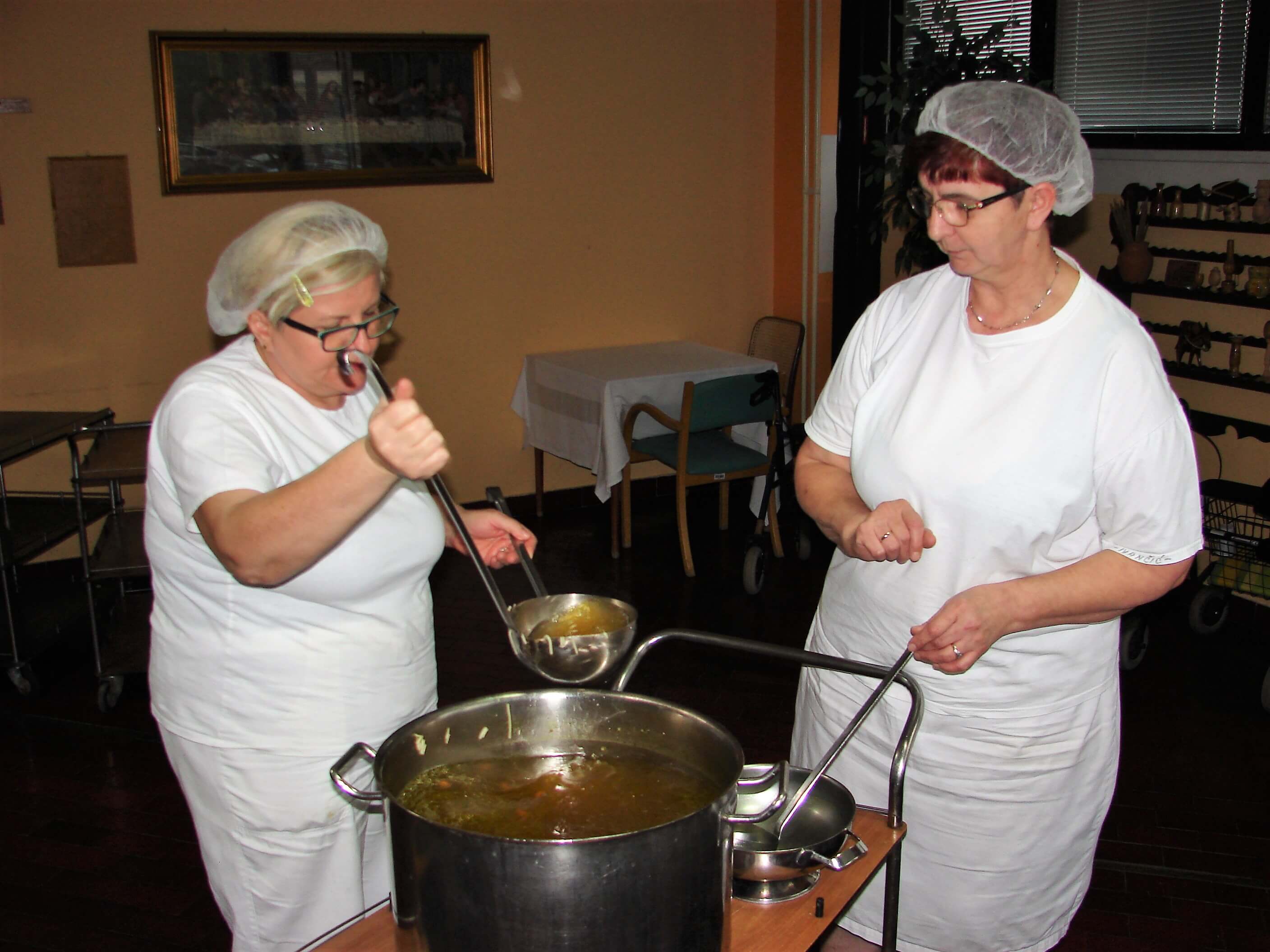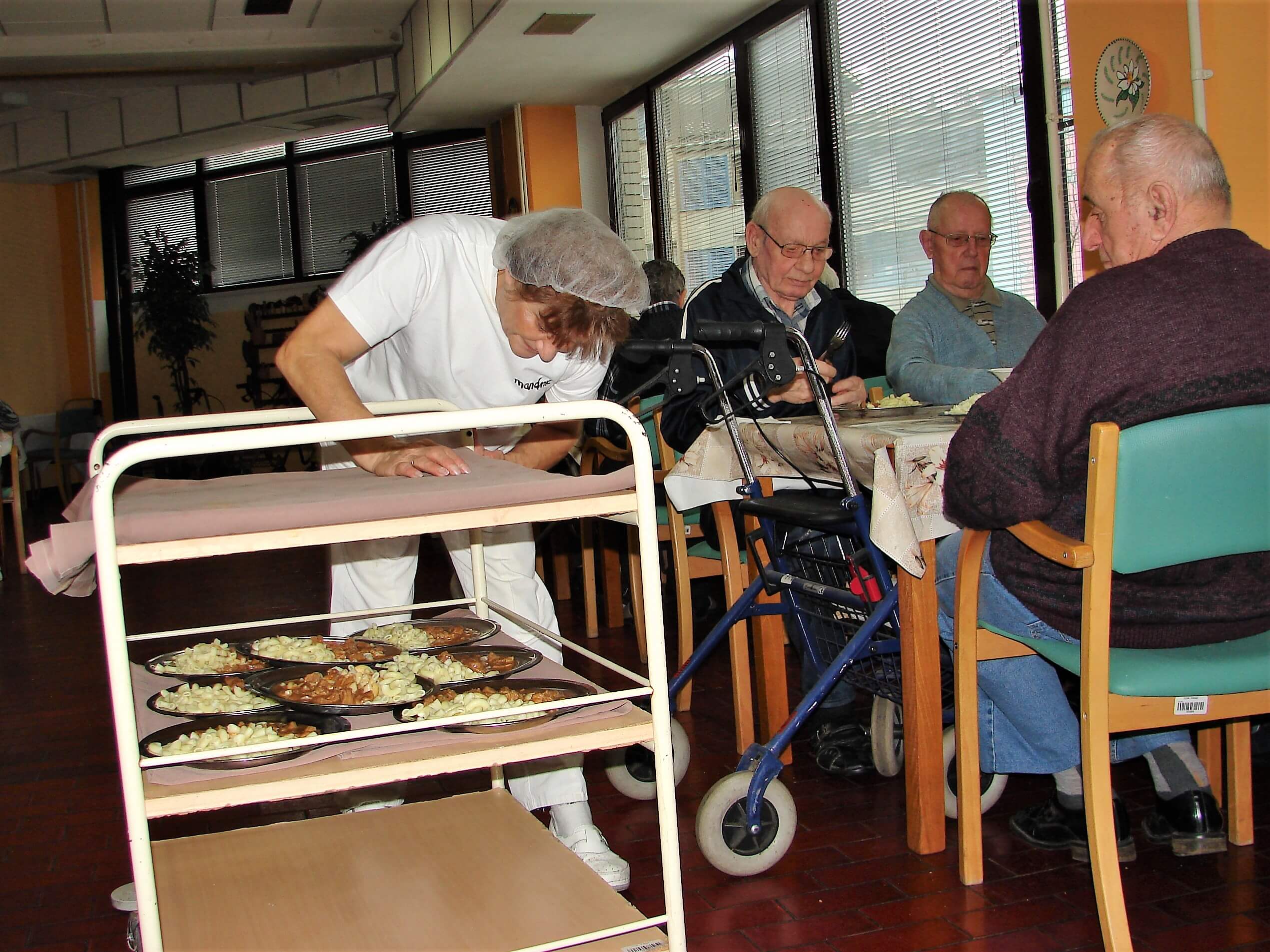 Točno u podne puni se velika sala sisačkog Doma za starije. Hodnikom se širi miris juhe, safta s tijestom i kupus salate. Žamor i druženje utišavaju kolica s juhom koju pomoću velike ‘šeflje’ grabe marljive kuharice. Dok jedni čekaju, drugi su već gotovi. Poslužiti dvjestotinjak korisnika odjednom nemoguća je misija, pa serviranje svakog tjedna započinje s drugog kraja restorana kako nitko ne bi bio zakinut s obzirom na ustaljeni raspored sjedenja. Stiže salata koja odmah nestaje s ponekih tanjura, dok drugi strpljivo čekaju glavno jelo…