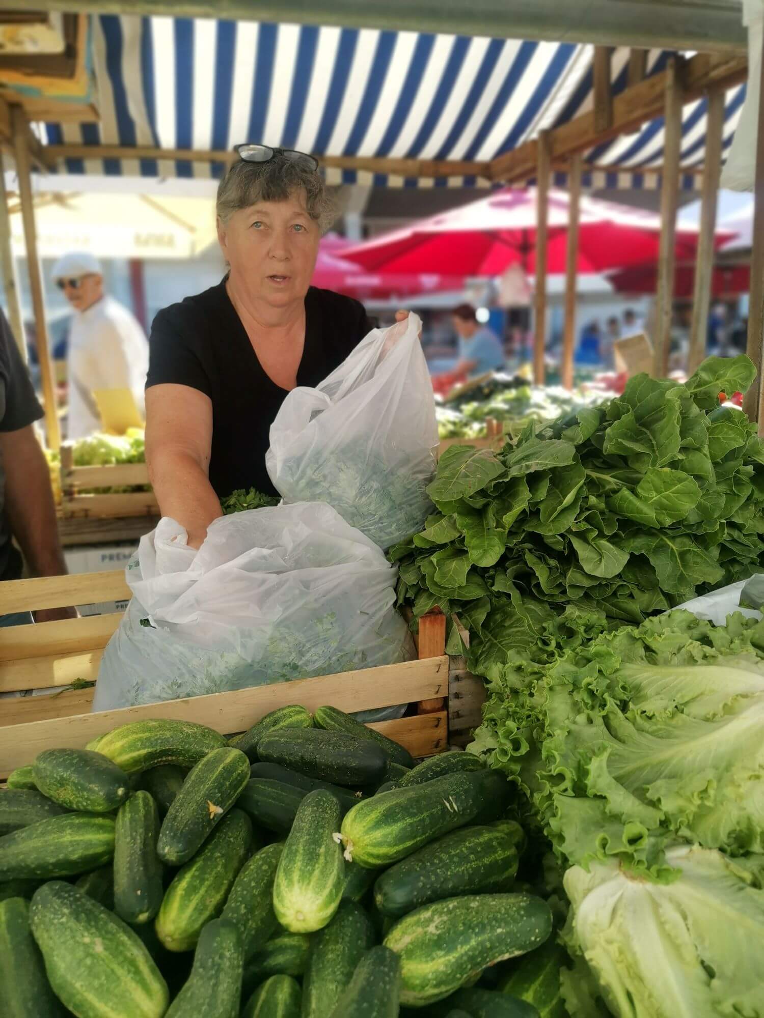Umirovljenica Jadranka (65) dobri je ‘duh’ šibenske pijace. Povrće joj je ukusno i domaće, a cijene pristupačne pa stalnih kupaca ne manjka. Na tržnici prodaje već 30 godina, a uz to iza sebe ima i 40 godina radnog staža. Naime, ranije je na štandu prodavala u sklopu obrta ‘Jadranka’, a sada ima obiteljsko poljoprivredno gospodarstvo. Na rad je navikla, a prvih 20 godina staža stekla je u robnoj kući Šibenka. Povrće uzgaja u Jadrtovcu, a većina onoga što prodaje je njezina. Ovih dana kupce mami ‘catama’ krastačama.