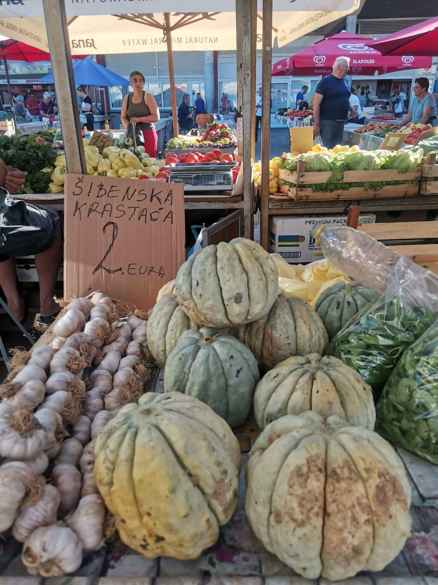 Šibenska pijaca, čija infrastruktura vapi za ozbiljnom obnovom, smještena je u središtu grada. Zimi su prizori pomalo otužni, ali ljeti tržnica puca od šušura. Domaći poljoprivrednici iz okolnih sela nude domaće voće i povrće, ali i med, maslinovo ulje, orahovac… Za stare sorte traži se euro više, dok kupci kukaju da im je skupo. Tu i tamo se i spusti koja cijena za euro, samo da se ne nosi nazad kući. Prodaja je, kažu ‘bakice’, na rubu isplativosti, jer im kruh oduzimaju prekupci, dok kupci radije idu u rashlađene centre gdje kupe za manje, a ne moraju tražiti ni plaćati parking.