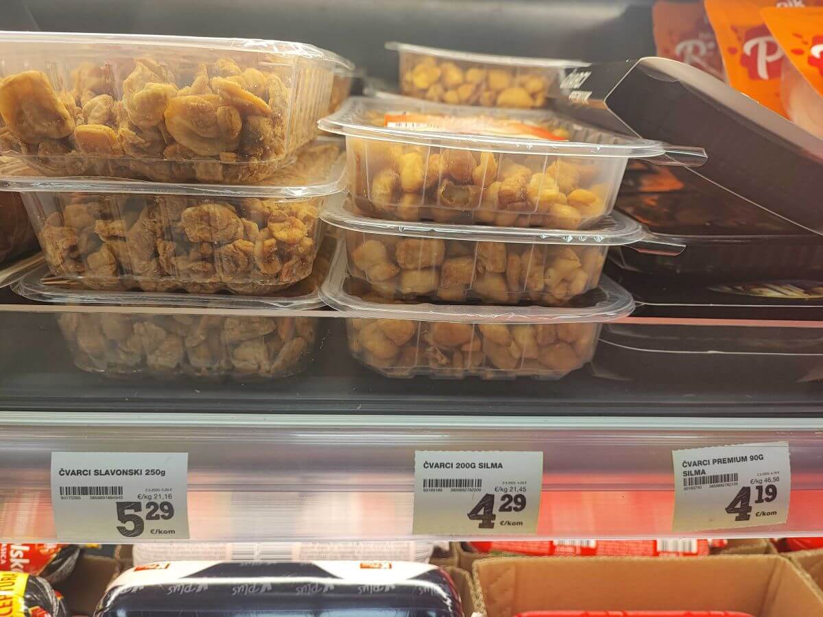 Provjerili smo cijene čvaraka i u jednom domaćem trgovačkom lancu. Kad gledamo po kilogramu, prodaju se za 19,95, 21,16 i 21,45 euro. U ponudi su i premium čvarci koji se prodaju u pakiranju od 90 grama za 4,19 eura, a po kilogramu to iznosi 46,56 eura.
