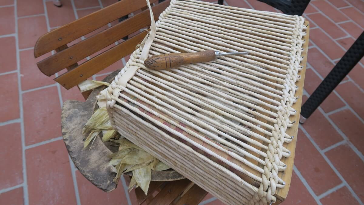 Prvo treba nabaviti materijal. Na jesen treba ubrati komušinu, odnosno ‘luščiju’, kako to zovu u Nedelišću, ali mora biti domaća, a ne hibrid. Dušanka objašnjava da komušina od hibrida bude pretvrda pa od toga previše stradaju prsti. Budući da se sve više koriste kombajni pri berbi kukuruza, sve je teže naći komušinu za pletenje, ali Dušanka poručuje “ko voli, taj bu se pobrigal”. Odnosno, gdje ima volje, ima i načina.