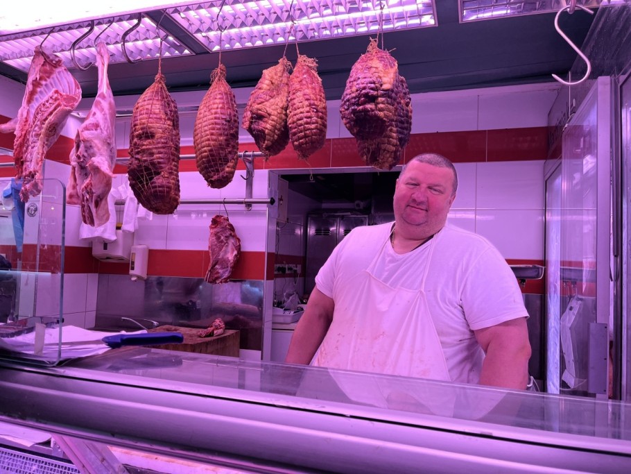 Za Uskrs i Nenad prodaje rolane šunke, cijele šunke u komadu, teletinu i janjetinu za pečenje. Janjetina je 15 eura, dok su šunke u rolici deset eura. Također, komadi šunke bez kosti koštaju 12 eura i teletina je od deset do 13 eura po kilogramu. Nisu dignuli cijene od prošle godine, ali vidi da ostali jesu, ističe Nenad.