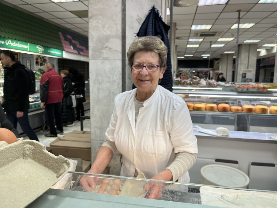 Osim mesa, za Uskrs se kupuje i puno svježih jaja, što za jelo, što za bojanje. Svježa jaja kod gospođe Danice koštaju tri i pol eura. Cijena je kod nje ista kakva je i bila. Redovito prodaje na Dolcu na odjelu za mliječne proizvode i kaže da ne planira povisiti cijenu svojim mušterijama. Umirovljenici su nam rekli da je sve poskupjelo, ali da za Uskrs žele nabaviti uobičajeno za blagdanski stol. Evo što ovdje o cijenama kažu Ana i Dabiša, ali i prodavači na Dolcu.